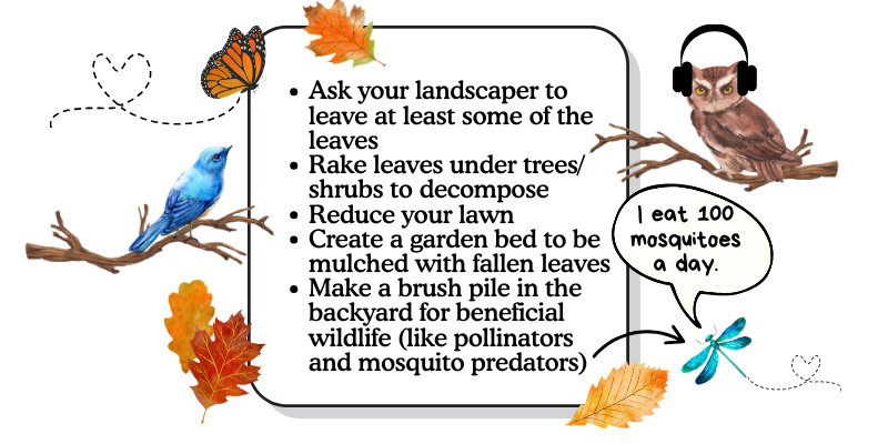 - Ask your landscaper to leave SOME of the leaves as free mulch, free fertilizer, and habitat for beneficial insects.