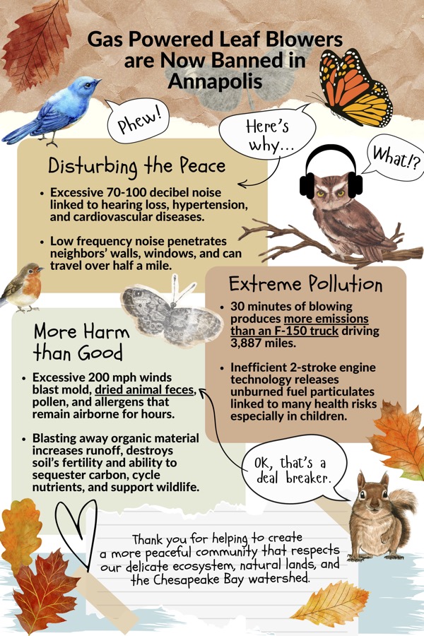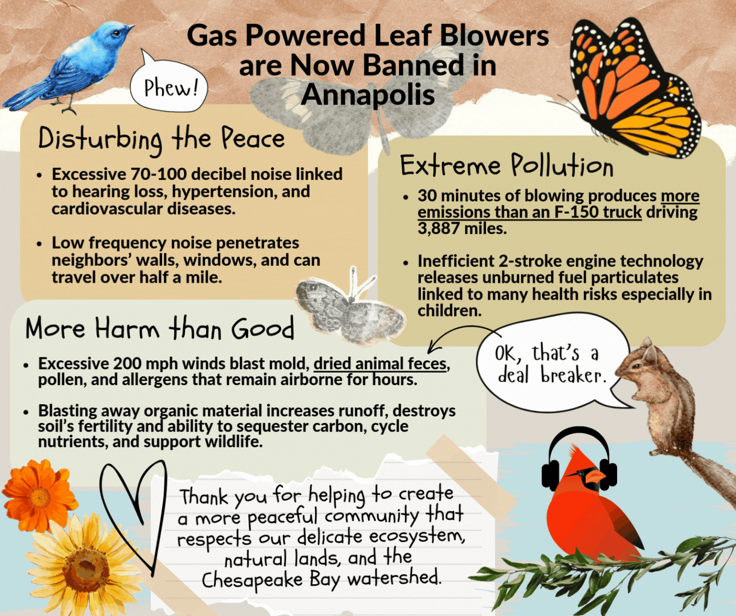 As of January 2025 Annapolis has joined the 200 municipalities across the country that have banned gas leaf blowers. Two-stroke engines have been phased out in all industries except for yard work, and people are beginning to realize that these tools do more harm than good.